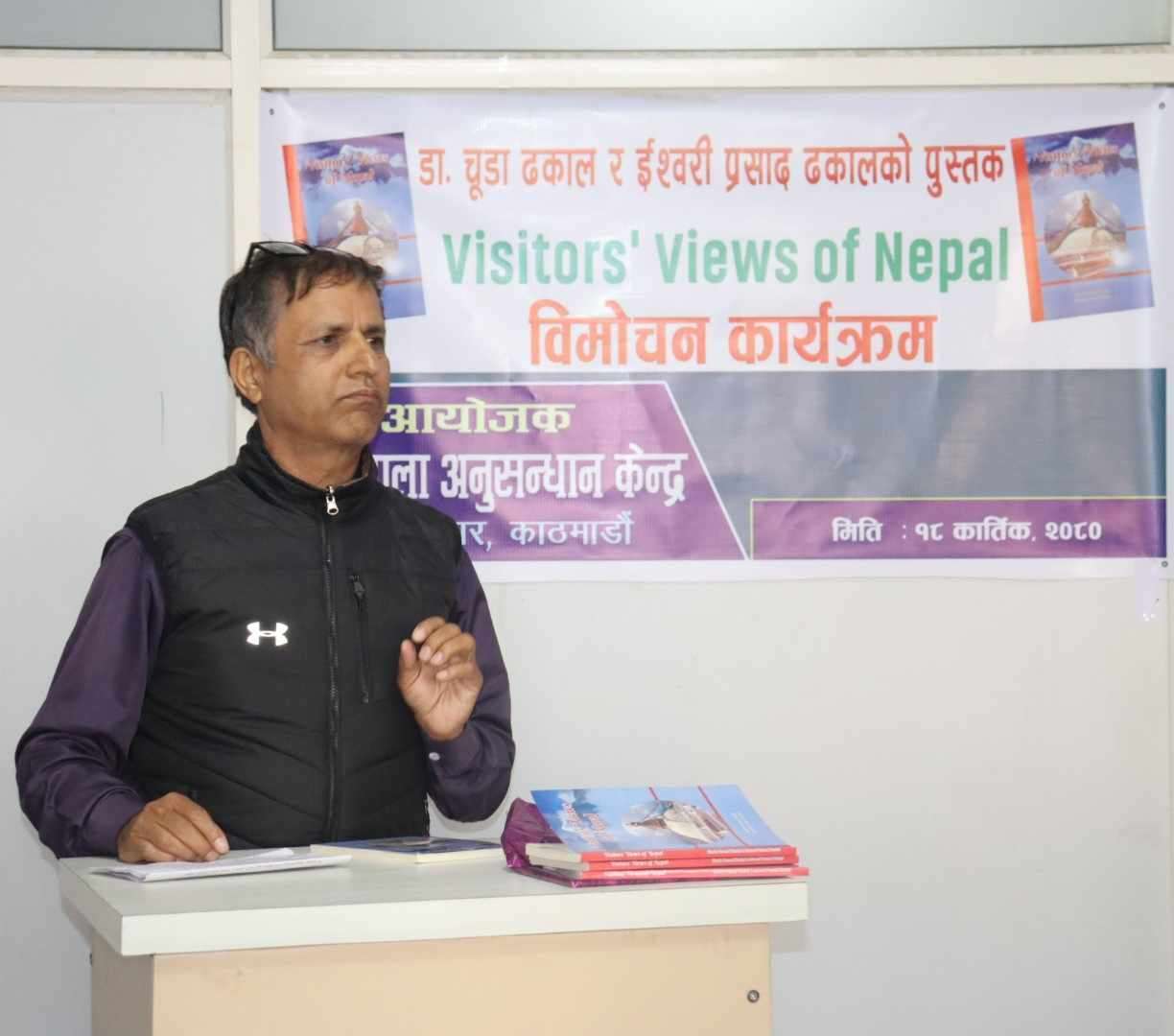 कार्तिक १८, काठमाडौँ । काठमाडौँ–१६, नयाँबजार स्थित ज्ञानशाला अनुसन्धान केन्द्रको आयोजनामा विदेशी पर्यटकहरूको भावना समेटेको पुस्तक, visitor views of Nepal विमोचन गरिएको छ । कार्यक्रममा विभिन्न पर्यटन व्यवसायी, सामाजिक तथा राजनीतिक व्यक्तित्वहरूको उल्लेखनीय उपस्थिति रहेको थियो । पर्यटक व्यवसायी नवराज दाहाल, माओवादी नेता लेखनाथ न्यौपाने, प्राज्ञ डा.कौशिला रिसाल, पत्रकार सुकदेव दाहाल र अधिवक्ता विमल पोख्रेलले संयुक्त रूपमा पुस्तकको विमोचन गरेका थिए । पुस्तकको लेखक द्वय, डा.चूडा ढकाल र ईश्वरीप्रसाद ढकाल हुन् ।