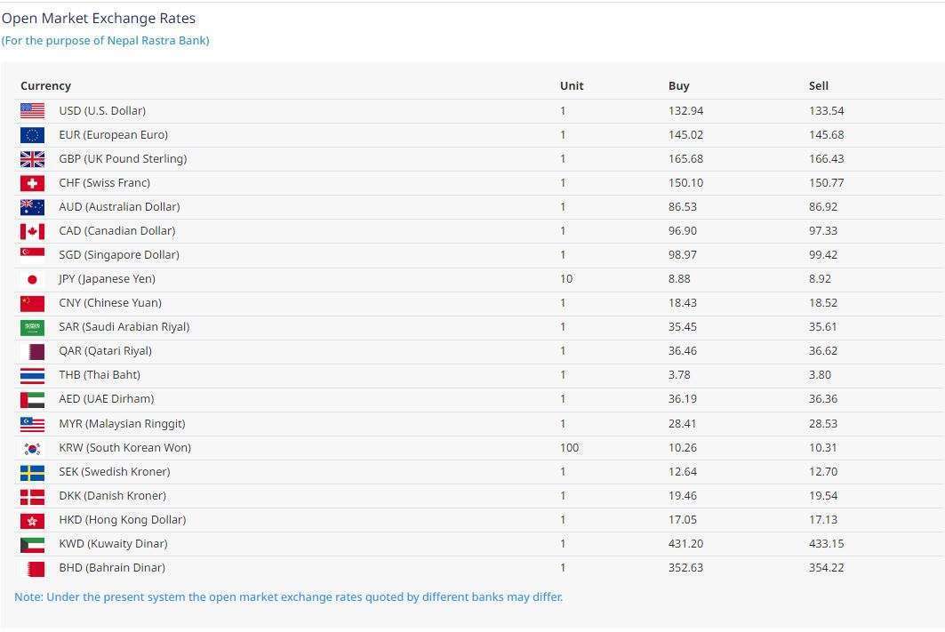 राष्ट्र बैंकले आजका लागि अमेरिकी डलरको १ को खरिद दर १३२ रुपैयाँ ९४ पैसा र बिक्री दर १३३ रुपैयाँ ५४ पैसा कायम गरेको छ भने युरोपियन युरो एकको खरिद दर १४५ रुपैयाँ ०२ पैसा र बिक्री दर १४५ रुपैयाँ ६८ पैसामा कारोबारको अनुमति दिएको छ ।