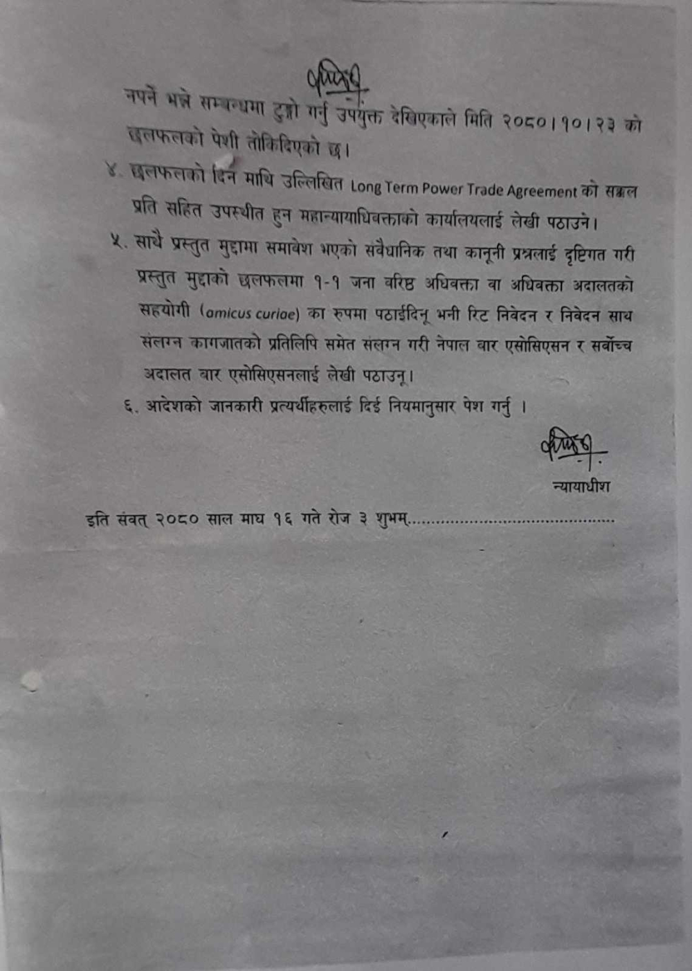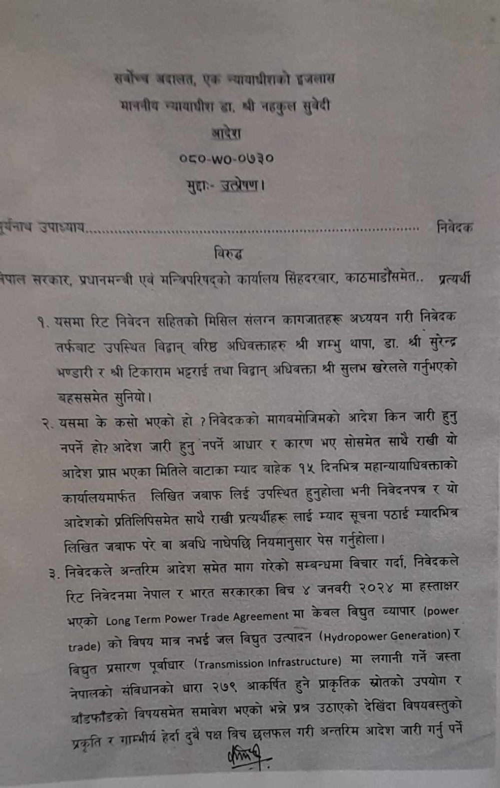 ‘निवेदकले अन्तरिम आदेश समेत माग गरेको सम्बन्धमा विचार गर्दा, निवेदकले रिट निवेदनमा नेपाल र भारत सरकारकाबीच ४ जनवरी २०२४ मा हस्ताक्षर भएको ‘लङ टर्म पावर ट्रेड एग्रीमेन्ट’ मा केवल विद्युत व्यापार को विषय मात्र नभई जलविद्युत् उत्पादन र विद्युत प्रसारण पूर्वाधार मा लगानी गर्ने जस्ता नेपालको संविधानको धारा २७९ आकर्षित हुने प्राकृतिक स्रोतको उपयोग र बाँडफाँडको विषयसमेत समावेश भएको भन्ने प्रश्न उठाएको देखिँदा विषयवस्तुको प्रकृति र गाम्भीर्य हेर्दा दुवै पक्षबीच छलफल गरी अन्तरिम आदेश जारी गर्नु पर्ने नपर्ने भन्ने सम्बन्धमा टुङ्गो गर्नु उपयुक्त देखिएकाले मिति २०८०/१०/२३ को छलफलको पेशी तोकिदिएको छ’ आदेशमा छ ।