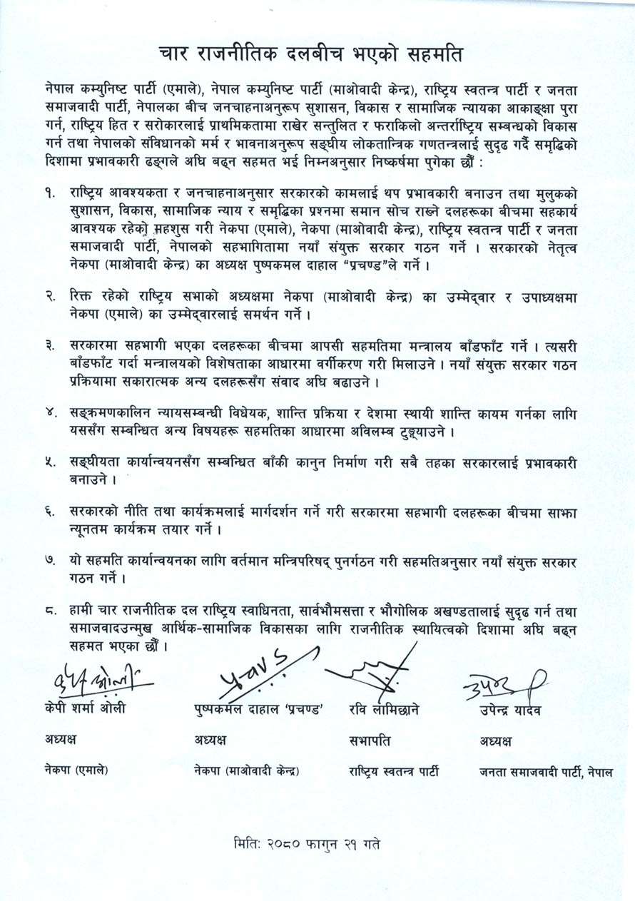 सहमतिअनुसार सरकारको नेतृत्व नेकपा (माओवादी केन्द्र) का अध्यक्ष पुष्पकमल दाहाल ‘प्रचण्ड’ले गर्नेछन् । त्यस्तै राष्ट्रिय सभाको अध्यक्षमा नेकपा माओवादी केन्द्रले उम्मेदवारी दिने भएको छ भने उपाध्यक्षमा नेकपा एमालेले उम्मेदवारी दिने भएको छ ।