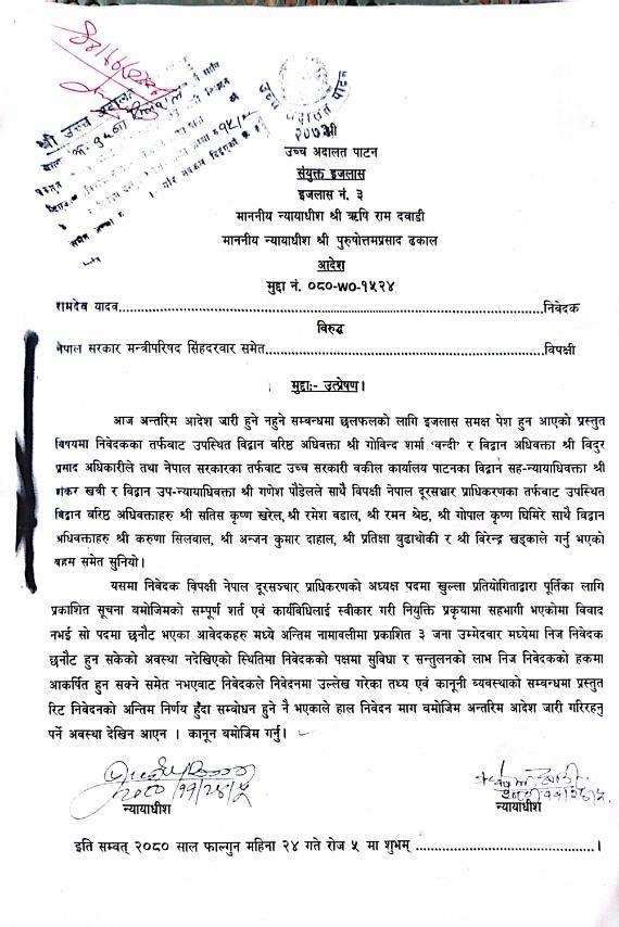 रिट निवेदक रामदेव यादवले अध्यक्ष भुपेन्द्र भण्डारीसहित दूरसञ्चार प्राधिकरण, सञ्चार तथा सूचना प्रविधि मन्त्रालय र सिफारिस समितिलाई विपक्षी बनाएर रिट दायर गरेका थिए ।