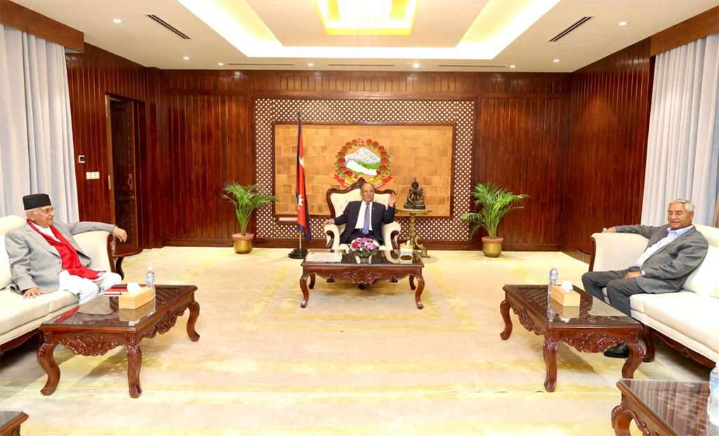 १८ चैत्र, काठमाडौं – प्रधानमन्त्री पुष्पकमल दाहाल, प्रमुख प्रतिपक्षी दल कांग्रेसका सभापति शेरबहादुर देउवा र सत्तारुढ एमालेका अध्यक्ष केपी शर्मा ओलीबीच शनिबार साँझ भेटवार्ता भएको छ ।