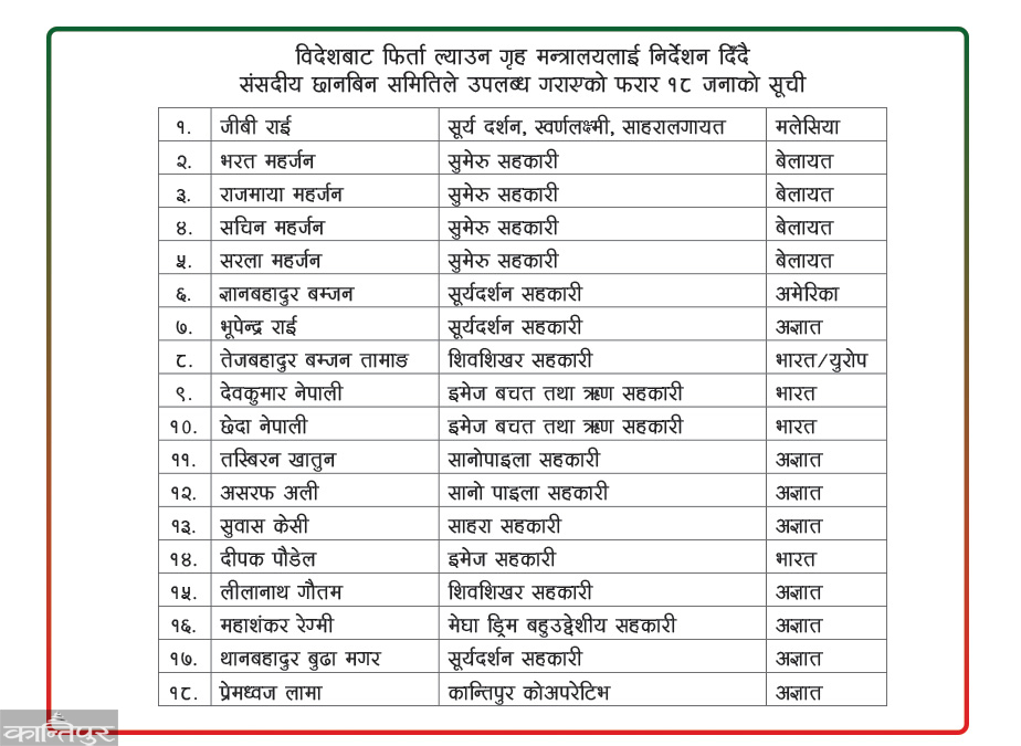 त्यस्तै सुमेरु सहकारीका भरत महर्जन, राजमाया महर्जन, सचिन महर्जन र सरला महर्जनको नाम पनि सूचीमा छ । सूर्यदर्शन सहकारीका पूर्वअध्यक्ष ज्ञानबहादुर बम्जन, थानबहादुर बुढा मगर, शिवशिखर सहकारीका भूपेन्द्र राई, तेजबहादुर बम्जन तामाङ र लीलानाथ गौतम, इमेज सहकारीका देवकुमार नेपाली, क्षेदा नेपाली र दीपक पौडेल, सानो पाइलाका तस्बिरन खातुन र असरफ अली, साहरा बचत तथा ऋण सहकारीका सुवास केसी, कान्तिपुर सहकारीका प्रेमध्वज लामा, मेगाड्रिम सहकारीका महाशंकर रेग्मी गरी १८ जनालाई विदेशबाट खोजेर ल्याउने संसदीय समितिले भनेको हो ।